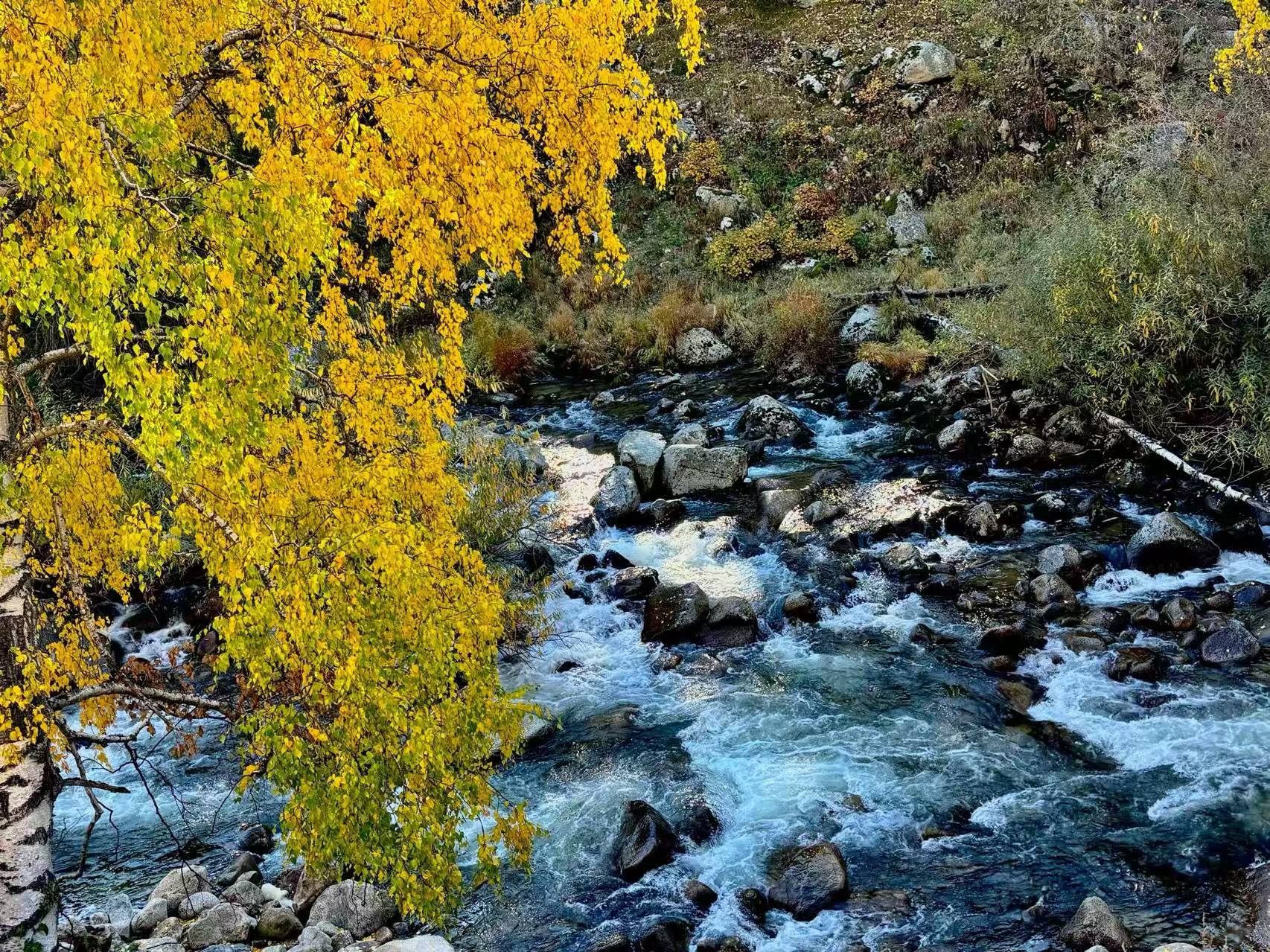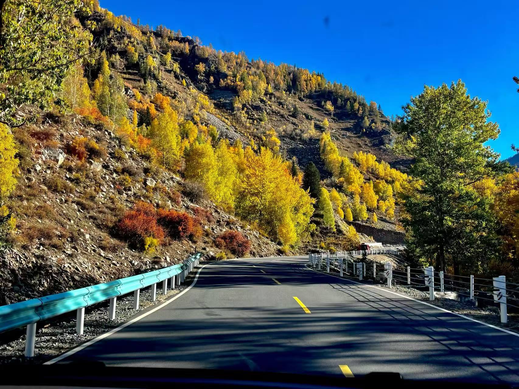 我們上了阿禾公路,全長209公里,公路沿途可欣賞森林、草原、峽谷、河流、石林、濕地、雪山,被稱為北疆景色最美的景觀公路,尤其是九月下旬至十月上旬的秋景。隨著海拔的升高,遠處高山出現了積雪,生長的樹木也和山谷不同,山谷地帶樹木品種比較豐富,黃葉以白樺樹居多,再往上便以針葉林為主,遠方高山雪線下的樹木的顏色已經完全轉為黃色。